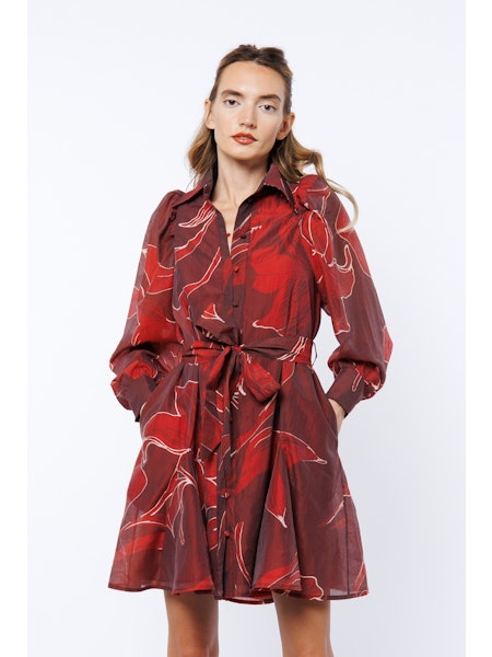 Make a statement in the Crimson Bloom Dress—a striking mini dress that blends structure with effortless femininity. Crafted in a rich wine-red fabric with sweeping abstract floral prints in crimson and blush, this piece features dramatic puff sleeves, a crisp collar, and a waist-defining tie belt. Its full skirt adds movement and charm, making it perfect for daytime events or a bold evening out. Sophisticated yet playful, this dress is your go-to for standing out with confidence.